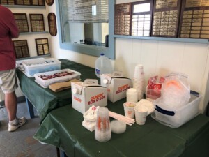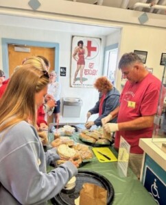 The committee was led by Brian Callanan and Terry Saunders. On Sunday, Brian, Terry, Steve Saunders, Bill Lee and Pat Albanese gathered to bag all the bagels and pastries. They along with Carole Mendoza, Anne Prior, Scott Puopolo and Laura Puopolo gathered at 7:00 am set up the food inside the bathhouse due to possible rain showers. The Falmouth Enterprise was in attendance and wrote a story that was on line on Tuesday, 07/30/24 and in the paper on Friday, 08/02/24.